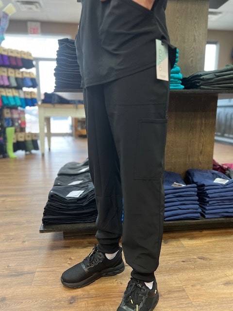 This Men’s Modern fit mid rise pull-on drawstring jogger has a rib-knit waistband with interior elastic for comfort and security. There are six pockets for storage: two front pockets, one zip cargo pocket, one patch cargo pocket, and two back patch pockets. Rib-knit cuffs complete the look. Tapered leg, 10″ opening. Inseam: 30 1/2″