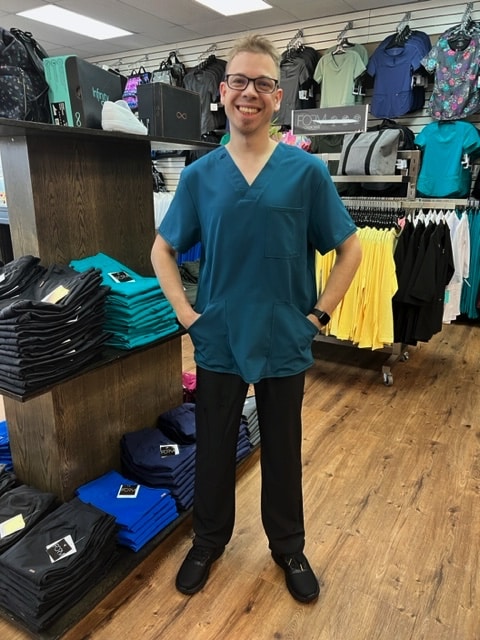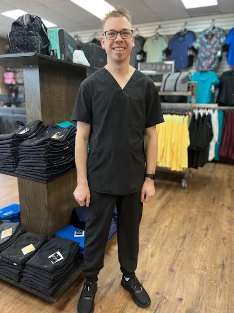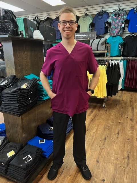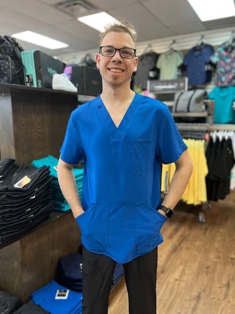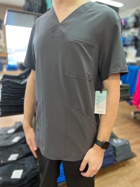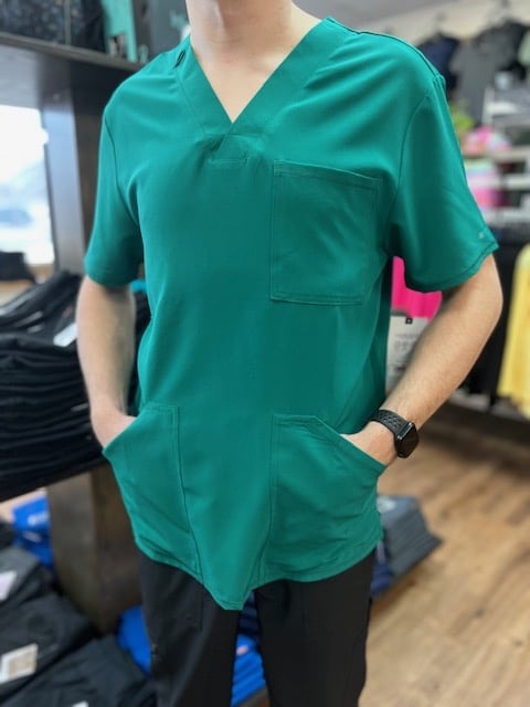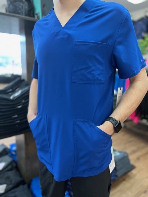 February 1, 2023This Men’s Modern fit V-neck top has a bungee ID badge loop at the neck and a back yoke seam. There are three pockets: one chest pocket and two front patch pockets. Side vents give this top ease of movement. Center back length: 28″