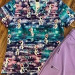 August 15, 2025This modern classic fit V-neck top combines functionality and style with two front pockets, short sleeves, and side vents for added comfort and mobility. Designed with a flattering silhouette, it’s the perfect blend of practicality and personality. Seasonal prints add a fun, expressive touch to refresh your workday look. CBL: 26″.