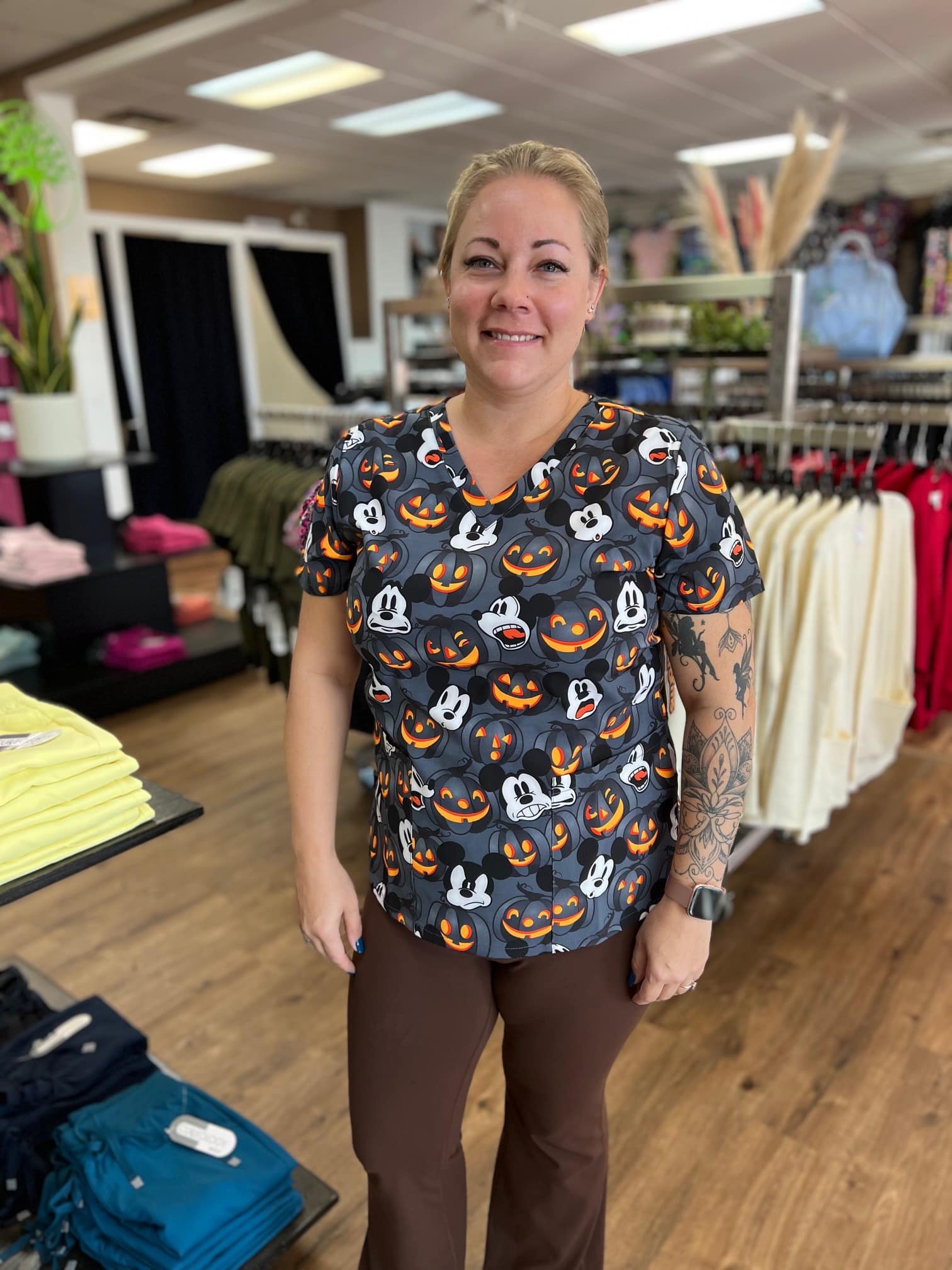 August 15, 2025This modern classic fit V-neck top combines functionality and style with two front pockets, short sleeves, and side vents for added comfort and mobility. Designed with a flattering silhouette, it’s the perfect blend of practicality and personality. Seasonal prints add a fun, expressive touch to refresh your workday look. CBL: 26″.